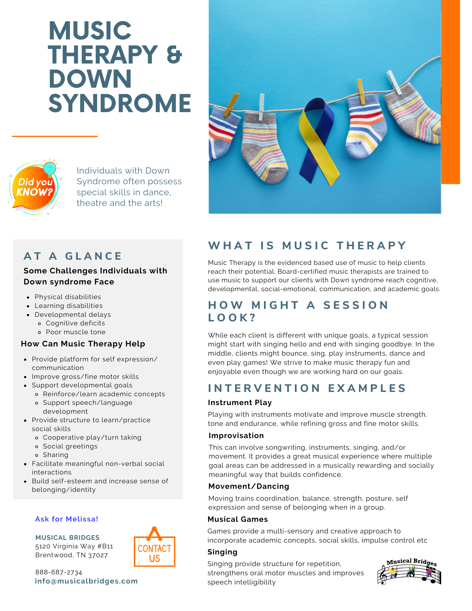 We work with a wide variety of diagnosis, Down syndrome being one of the top populations seen at Musical Bridges. Individuals with this diagnosis can greatly benefit from the use of Neurologic Music Therapy as there are several cognitive aspects within their diagnosis.