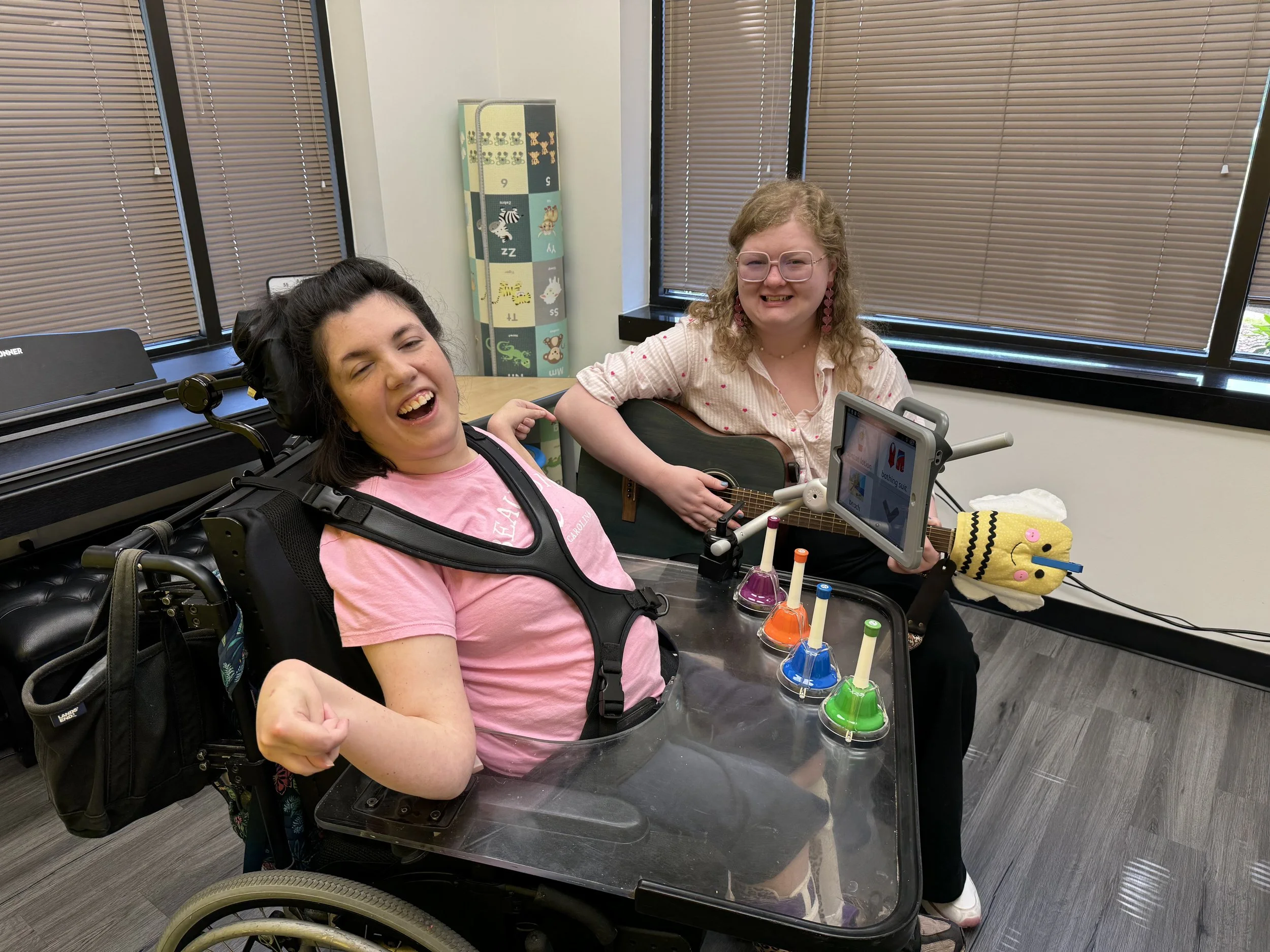 When working with sign language and AAC in music therapy, the process is similar to that of verbal speech. We incorporate these communication methods into songs and activities, making slight adjustments—such as allowing for longer pauses—to ensure clients can fully participate and express themselves.