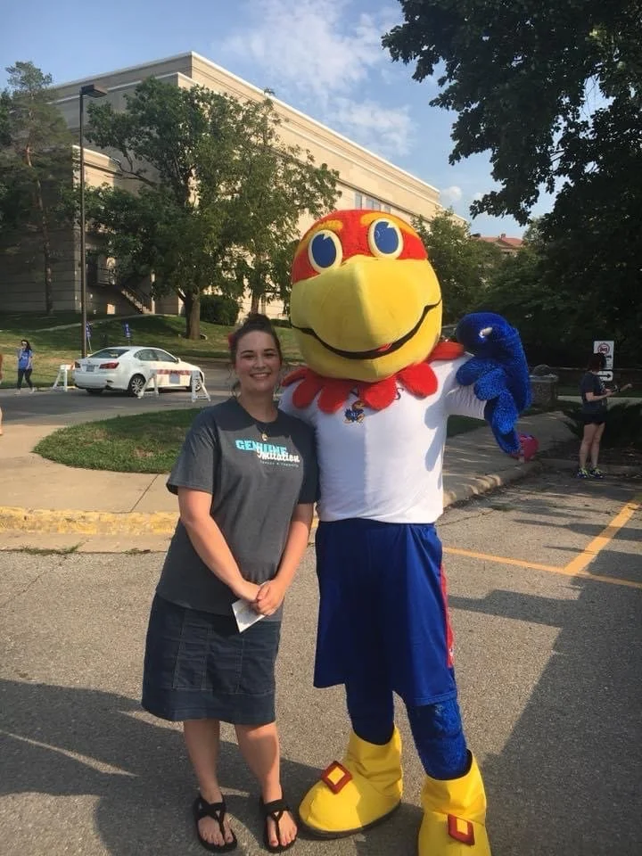 Ms. Proctor standing outside with the mascot of her alma mater—Big Jay!